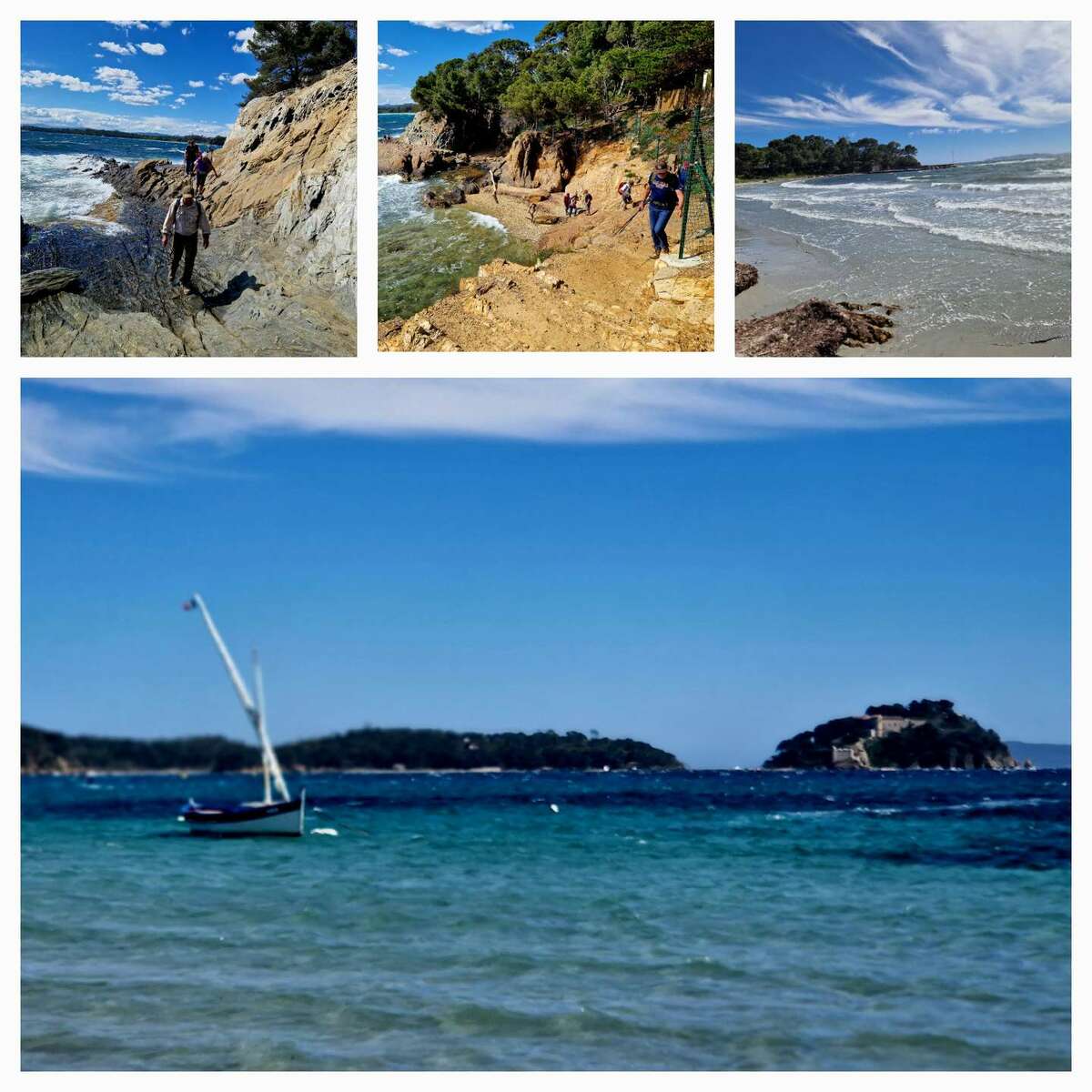 La descente nous a conduits à travers les rangées ordonnées des vignes du Domaine de la Sanglière, avant de retrouver le bord de mer. Arrivés sur le sable fin de la plage de Pellegrin, nous avons rejoint le sentier littoral. Après une halte sur la plage de Léoube, véritable joyau préservé. Ce sentier côtier nous a guidés jusqu’à notre destination finale : la mythique plage de Cabasson, faisant face au Fort de Brégançon. Une traversée assez rude avec ces marches inégales.