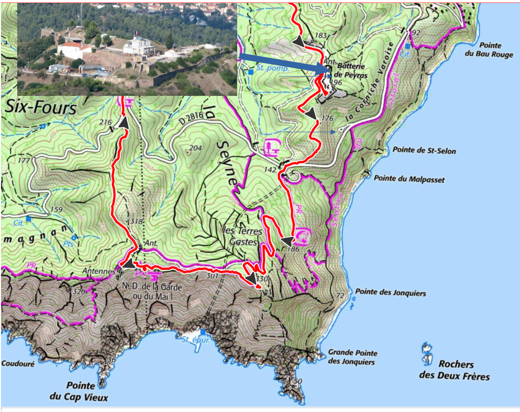 Située à l'est du massif du Cap Sicié à 200 mètres d’altitude surplombant la corniche varoise,depuis la fin du XIXème siècle, la batterie de Peyras nous accueille pour une visite particulière animée par Bernard notre guide conférencier assisté de Joel son frère. La batterie faisait partie du vaste ensemble de défense côtière "Séré de Rivière". Celle-ci protégeait le port militaire de Toulon en croisant ses tirs avec ceux de la batterie de Saint-Elme à Saint Mandrier située plus à l'est.