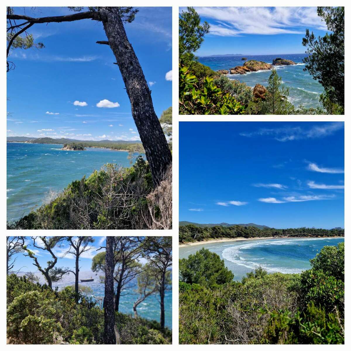 La descente nous a conduits à travers les rangées ordonnées des vignes du Domaine de la Sanglière, avant de retrouver le bord de mer. Arrivés sur le sable fin de la plage de Pellegrin, nous avons rejoint le sentier littoral. Après une halte sur la plage de Léoube, véritable joyau préservé. Ce sentier côtier nous a guidés jusqu’à notre destination finale : la mythique plage de Cabasson, faisant face au Fort de Brégançon. Une traversée assez rude avec ces marches inégales.