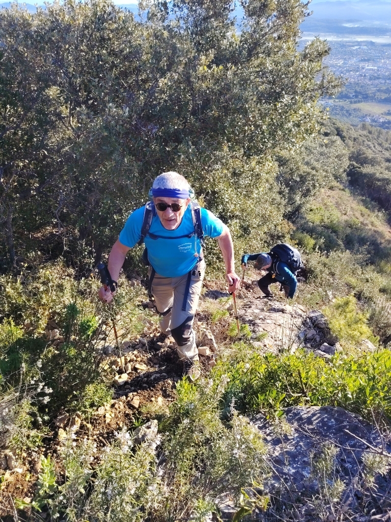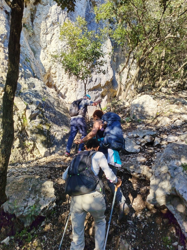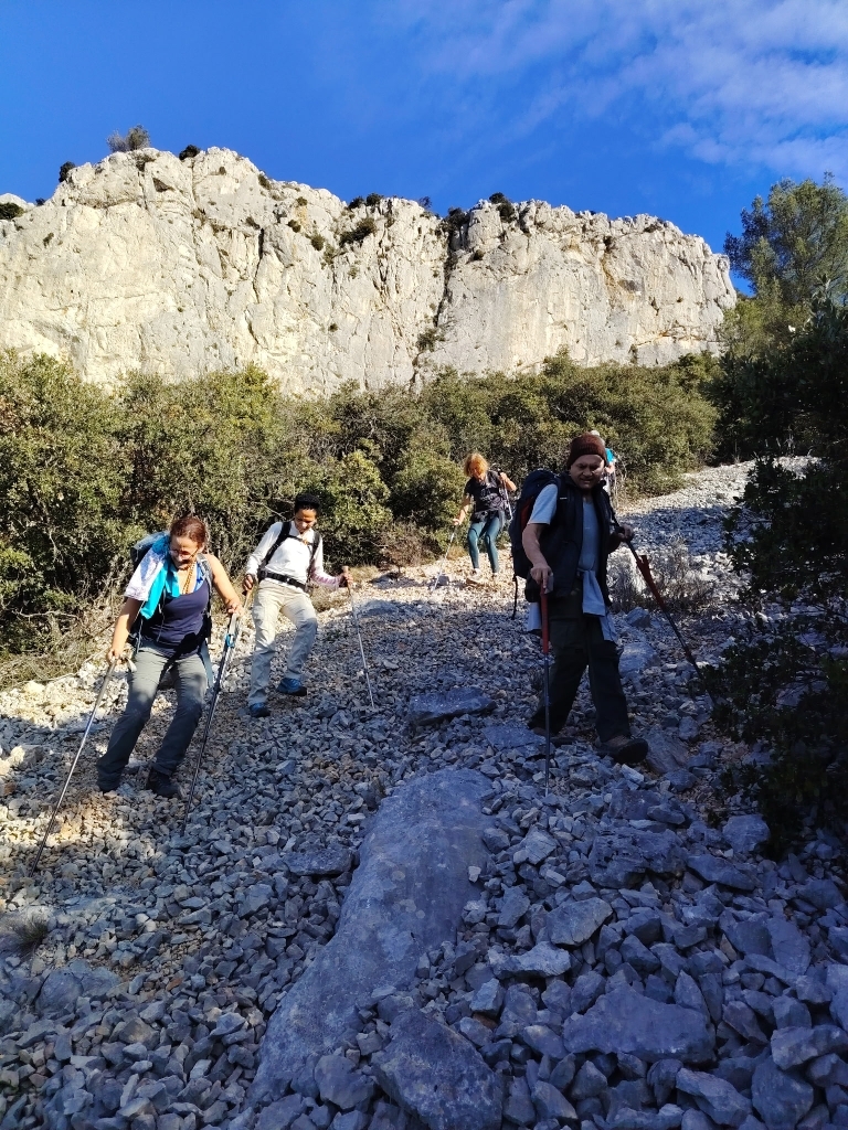 Ce fut effectivement une journée physique, voire très physique avec une descente ardue sous la falaise du Coudon puis une remontée inédite dans une cheminée où nous n’avons croisé qu’une seule chèvre.